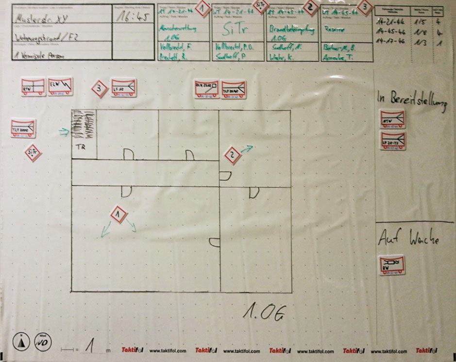 Aus diesem Grund führte die Freiwillige Feuerwehr Wildemann im Dezember 2015 die eigens für unsere Bedürfnisse entwickelte „Lagekarte Atemschutz“ ein. Grundlage ist eine Taktifol-Schreibfolie, welche auf nahezu allen glatten Oberflächen haftet. Dazu wurden passende Symbole für Trupps, Fahrzeuge und andere Einsatzschwerpunkte angefertigt. Der Gesamtpreis liegt nur bei insgesamt ca. 50€ und konnte durch die Wehrkasse finanziert werden.